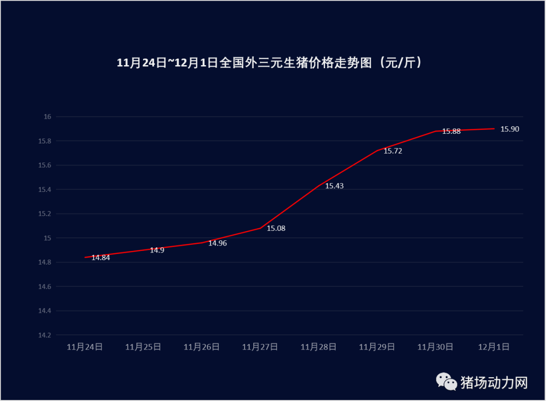自从11月24日开始,猪价出现“爆发式”上涨现象,根据“动力猪价”指数统计,短短七天时间,猪价从14.84元/斤上涨到15.90元/斤,一周时间,涨幅超过1元,四川、重庆、广西、海南等省区甚至突破了17元/斤的关口。